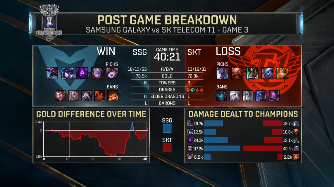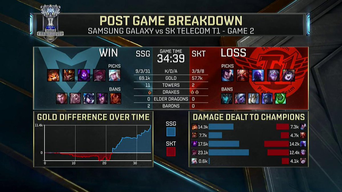 La seconde game a remis SKT sur de bons rails lors de l’early game. Réussissant à prendre 4k gold sur SSG, ils sont arrivés nettement en tête à la 20e minute. Mais c’était sans compter sur le fight Samsung une nouvelle fois. Grâce à un Wombo Combo très bien pensé sur la phase de draft, ils ont réussi à reprendre 13k gold à l’équipe SKT lors de son power spike. La partie s’est terminée en 35 minutes, et Samsung menait alors 2-0 cette finale avec trois balles de match.